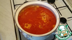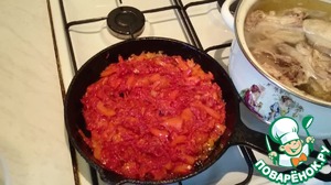 Варим 15 минут. Затем перекладываем в кастрюлю зажаренные овощи с томатной пастой и продолжаем готовить ещё 10 минут.