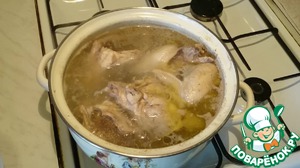 Бульон готовился 1 час. Шумовкой достаём курицу из бульона и убираем охлаждать, в дальнейшем мы отделим мясо от костей.
