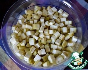 Подготовить баклажаны - очистить от кожуры и нарезать небольшими кубиками. Положить в миску и пересыпать солью (это поможет избавиться от горечи, но я очень часто пропускаю этот этап). Временно отставить в сторону.