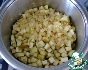Переложить обжаренный лук в кастрюлю, где будем варить суп. Баклажаны промыть от соли и переложить в кастрюлю с луком. Перемешать.