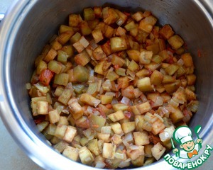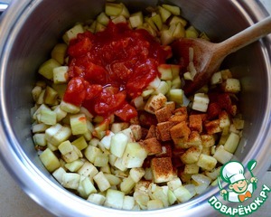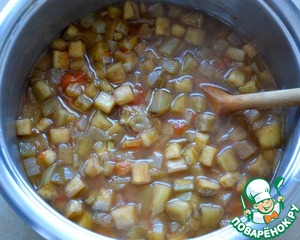 Помидоры также нарезать кубиками и добавить к овощам (можно использовать свежие помидоры, которые предварительно надо обдать кипятком и очистить от кожуры и семян). Положить корицу и паприку, поперчить по вкусу.