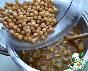 Консервированный нут промыть и добавить в кастрюлю. Можно, конечно, использовать предварительно отваренный нут.