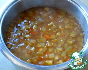 Влить горячий овощной бульон и варить все на среднем огне еще минут 7. Количество жидкости регулируйте по своему вкусу! Может потребоваться и чуть больше бульона...