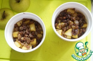 Затем выложить яблоки и клубничное пюре, тушить на медленном огне, помешивая, около 5 минут. Добавить промытый изюм и корицу, перемешать.