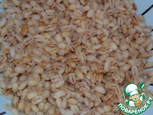 • Перловку промыть и отварить в соленой воде до готовности. Отбросить на дуршлаг и промыть.