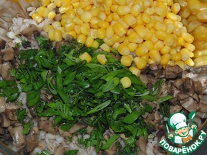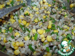 • Смешать жареные грибы, перловку, кукурузу и зелень.