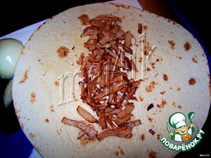 На лепёшку тортильяс выложить обжаренную мясную нарезку.