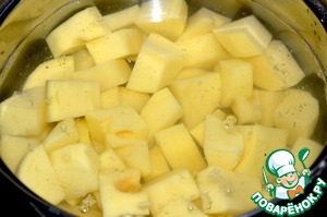Положить картофель в кастрюлю и залить водой. Варить до готовности. В конце варки посолить.