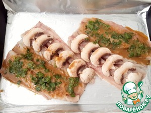 Нарезать шампиньоны ломтиками, выложить на рыбку, полить соусом...