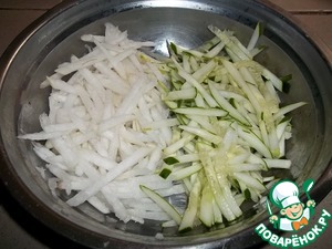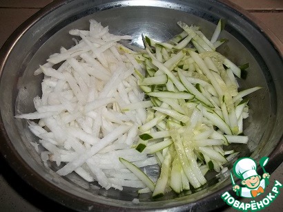 Пока остывают грибы и картофель с морковью, на той же терке натереть дайкон и огурец. Если огурец соленый, то нарезать соломкой.