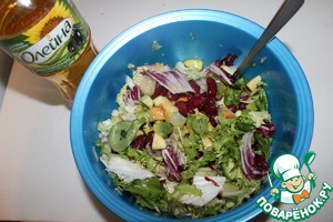 В большой миске смешать все ингредиенты салата, полить соусом и хорошо перемешать.