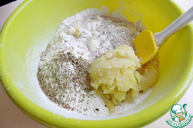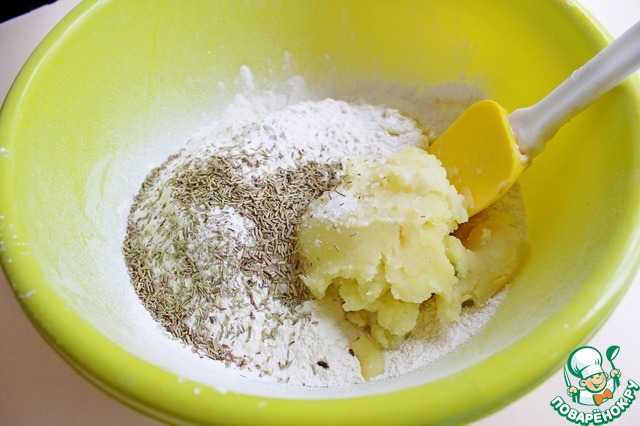 В миску просеять муку (не добавляйте сразу всю муку, добавьте сначала 400-450 г, а оставшуюся по мере необходимости), добавить к муке остывшее картофельное пюре, соль и сушеный розмарин.