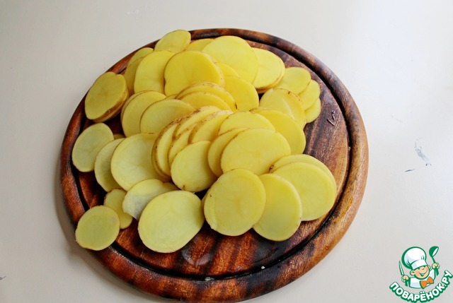 Молодой небольшой картофель нарезать очень тоненькими кружочками.