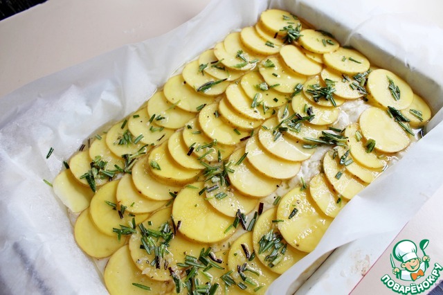 Выложить кружочки картофеля на тесто рядами, внахлест. Полить масляно-розмариновой заправкой и поставить выпекаться на 40-45 мин. при 180 град.