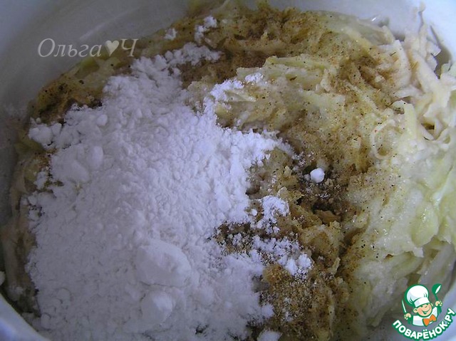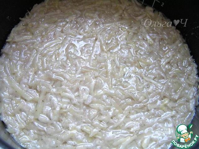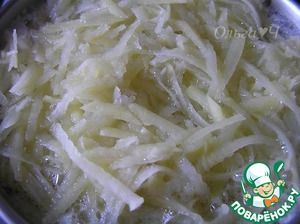 • Тем временем картофель очистить, натереть на терке, залить кипятком и оставить на 3-5 минут.