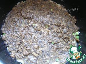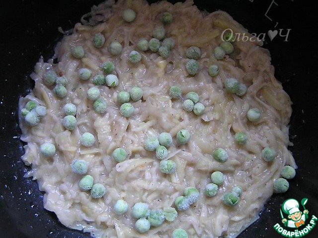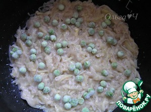 • Выложить половину картофельной массы в чашу мультиварки, смазанную маслом. Посыпать горошком (можно не размораживать).