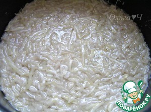 • Лук мелко нарезать, обжарить на растительном масле, добавить грибы, обжарить все вместе.