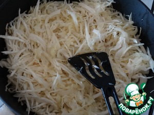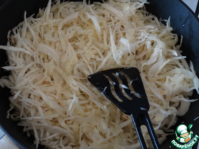 Свежую капусту тонко нашинкуем и выложим на горячую сковороду с растительным маслом. Крышкой не накрываем. Огонь средний, капуста не должна зажариться. Минут 10 жарим, часто перемешивая. -