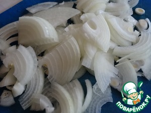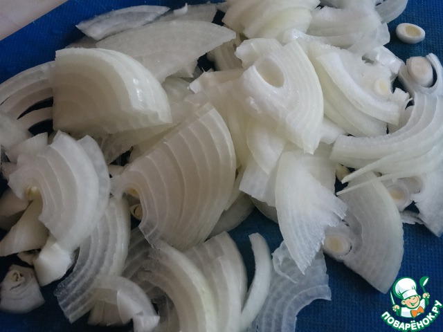 Лук очистить и нарезать прозрачными полосками, как на фото. Добавляем к капусте. Жарим еще минут 5.