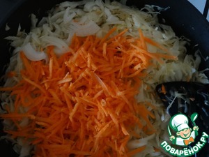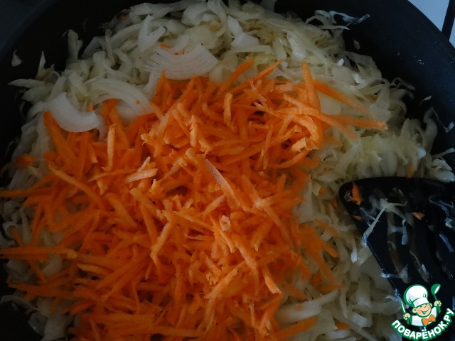 Морковь натираем на крупной терке, добавляем в сковороду, продолжаем жарку до мягкости овощей.