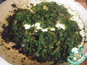 Добавить шпинат, посолить, поперчить, тушить, помешивая, 5-7 минут.