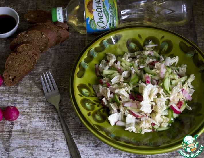 Пекинскую капусту хаотично порезать. Редис с огурцами отжать. В салатнике смешать редис, огурцы и пекинскую капусту. Заправить получившейся заправкой. Перемешать, дать настояться пол часа.