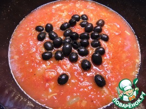 К обжаренным овощам добавить бульон, выпарить наполовину (5 минут). Добавить томаты в собственном соку (предварительно размять их), посолить, поперчить, варить 5 минут.