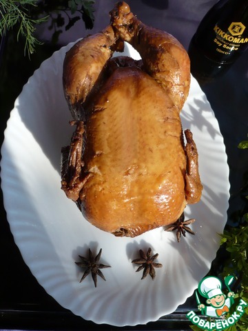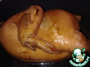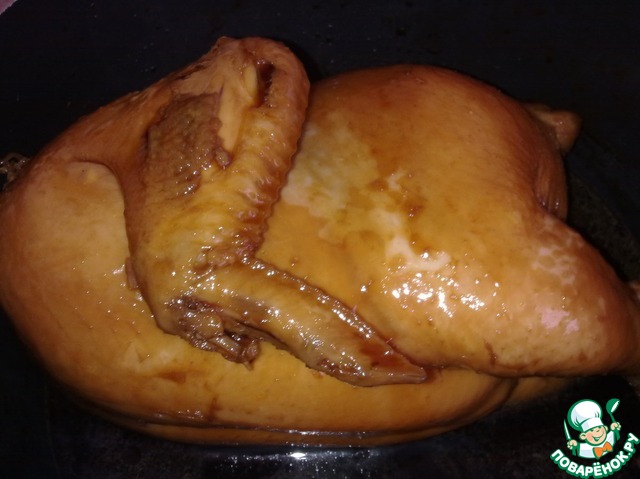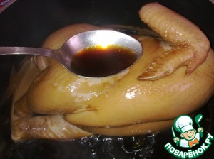 Переверните заметно загоревшую курочку на другой бок, и продолжите поливать ее еще 10 минут (Если выпарилось очень много соуса, добавьте 50 мл воды).