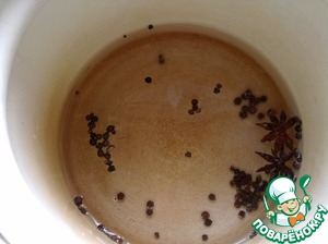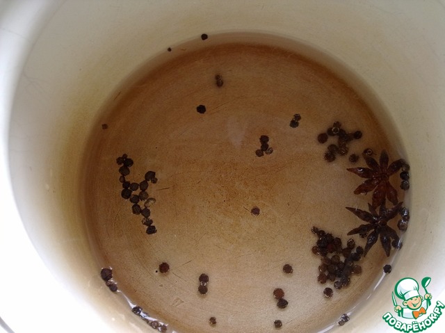 В маленькой кастрюльке смешайте 350 мл воды с бадьяном и сычуаньским перцем (у меня этого перца не было, я взяла черный перец горошком). Доведите воду до кипения, уменьшите огонь и варите 15 минут, пока жидкость не уварится до 180 мл
