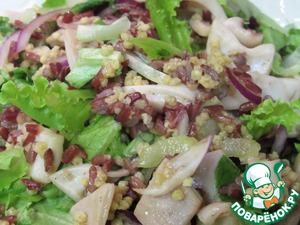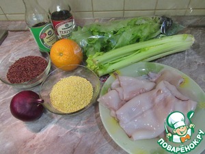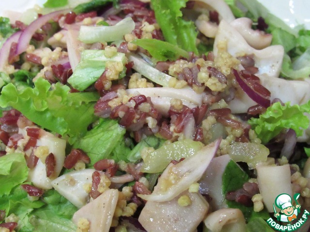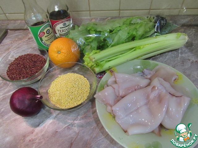Подготовим ингридиенты: почистим и вымоем кальмаров, у сельдерея удаляем жесткие волокна, моем и просушиваем салатные листья. Хорошо промываем рис и пшено. |