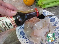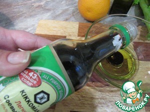 Готовим заправку. Смешиваем оливковое и кунжутное масло. Добавляем соевый соус, соль и перец. Из апельсина выжымаем сок. Добавляем 5-6 столовых ложек (по вкусу) |