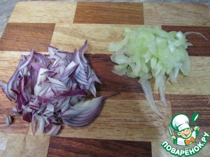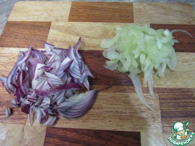 Нарезаем тонкими полосками лук и сельдерей. |