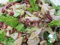 Так и этот салат: с легкой "зимней" луковой горчинкой и остротой салатных листьев, землистым ароматом риса, пшена и соевого соуса, мягким вкусом кальмаров и яркой "летней" ноткой апельсинового сока. Навеяный многогранной Тайской кулинарией и великолепными рецептами Юлии Высоцкой.