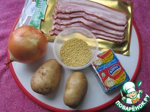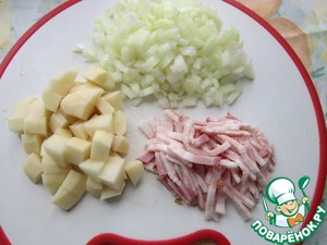 Нарезаем грудинку некрупными кусочками, лук и картошку кубиками.