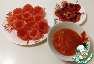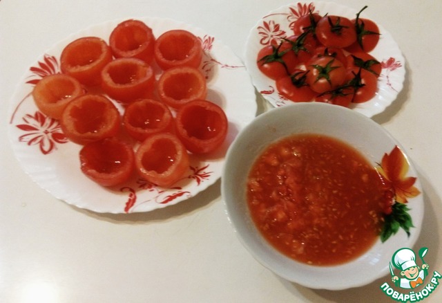 Помидоры помыть, обсушить, срезать крышечку и аккуратно ложечкой вынуть середину. Вынутую середину нарезать кубиком.