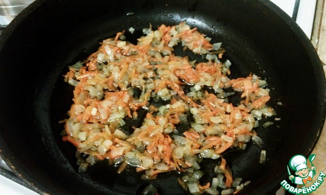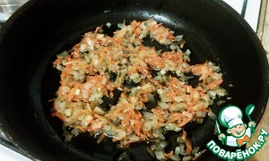 Лук нарезать кубиком, морковь натереть на терке. На растительном масле спассеровать лук и морковь до прозрачности и добавить кабачок.