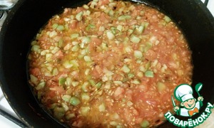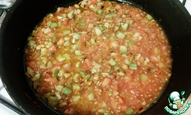 К наполовину готовому кабачку добавить серединки помидоров и тушить до готовности овощей. В конце добавить соль, сахар, перец, базилик по вкусу.