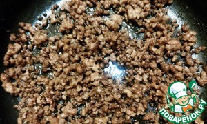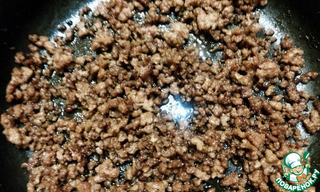 Пока готовилась наша основа, мы на второй сковороде с растительным маслом обжарим фарш до готовности. Посолить, поперчить по вкусу.