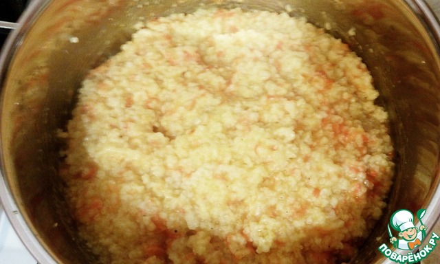 Через 25 минут каша сварилась. Добавляем в нее морковь и перемешиваем. Постная часть готова ))) Делим ее напополам.