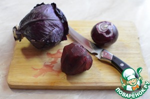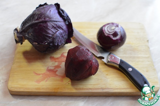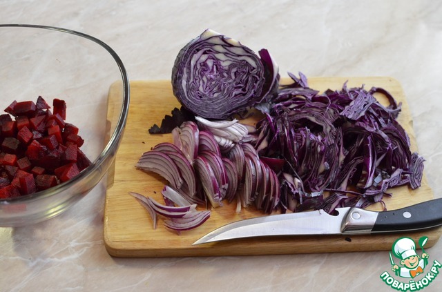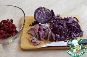 Порезать запеченную свеклу кубиками, капусту соломкой, красный лук полукольцами