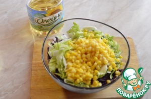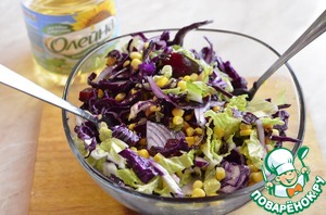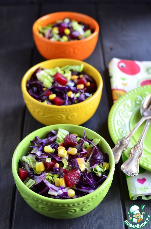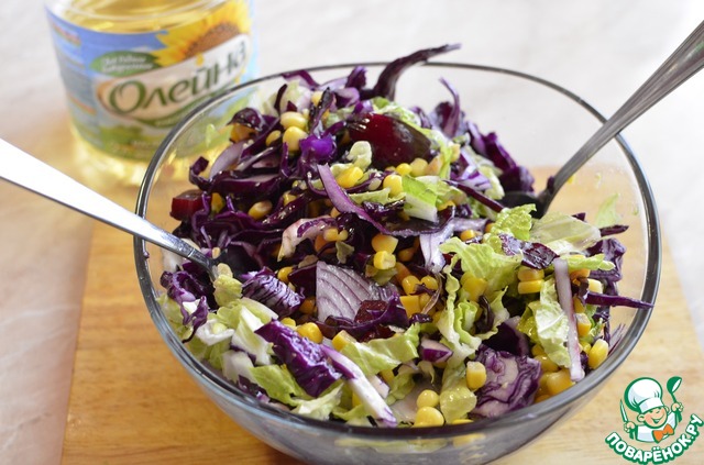 Выложить капусту лук и свеклу в миску, добавить кукурузу предварительно слив с нее жидкость.