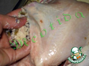 нежно, чтобы максимально не повредить шкурку, слегка ее оттягиваем и просовываем под нее сырную массу. B области грудки, ножек, в любом месте, куда у Вас будет тянуться рука, чтобы максимально равномерно распределить между шкуркой и мяском сырную смесь. -