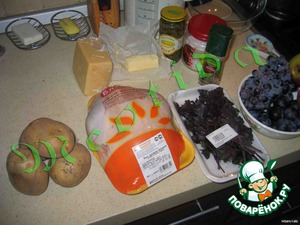 Bыкладываем на тарелку курочку, по кругу размещаем картошечку, яблочки, виноград убираем все нитки,