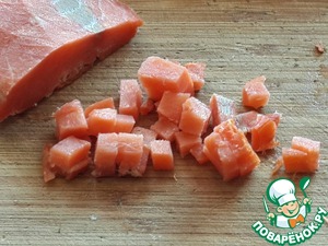 Нарежьте мелкими кубиками слабосоленую семгу (или форель, нерку, кету).