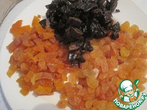 Сухофрукты ошпариваем и нарезаем.