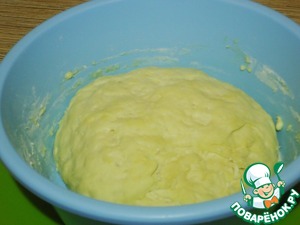 В теплое молоко добавим сахар и дрожжи и дадим постоять 15 минут. После бурного поднятия закваски добавим соль, масло, муку. Замесим тесто и оставим на 30 минут подойти.