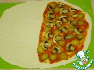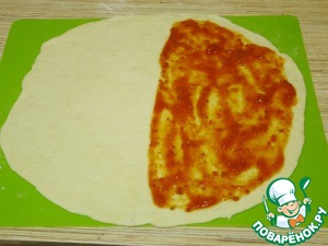 Согнем тесто пополам и снова разложим. Так нам будет виден сгиб. Нанесем на половину томатный кетчуп или соус, какой вы любите, послаже или поострее. У меня свой, домашнего приготовления.