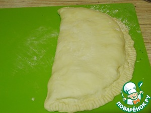 Накрываем начинку оставшейся половиной теста. Защипываем край теста. Вилочкой по контуру прижимаю тесто. Смазываю поверхность теста желтком. Если крупный, хватит на обе пиццы.
