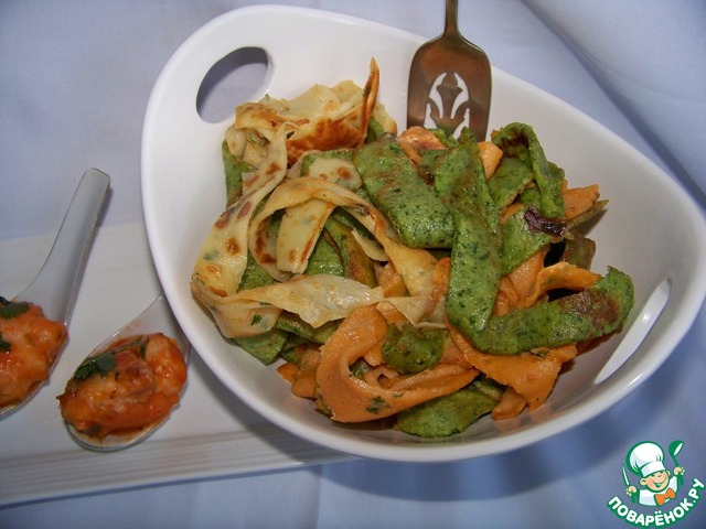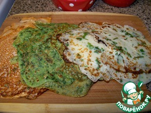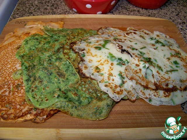 Приступим к приготовлению блинов. Налить в кастрюлю молоко, прибавить яйцо, соль и зелень петрушки. Осторожно перемешать, добавляя просеянную муку, чтобы получилось однородное тесто, как сметана. Блины выпекать на раскалённой сковороде с обеих сторон. Я приготовила 2 варианта: 1- обычные блины, 2 вариант- цветные, для красоты, добавив в 1.3 часть теста 2 ст. л. томатного сока, в другую 1.3 -шпинат 1-2 ст. л. (можно замороженный)