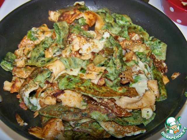 Остывшие блины нарезать на широкую лапшу и обжарить её в достаточно горячем жире до получения красивой румяной корочки.